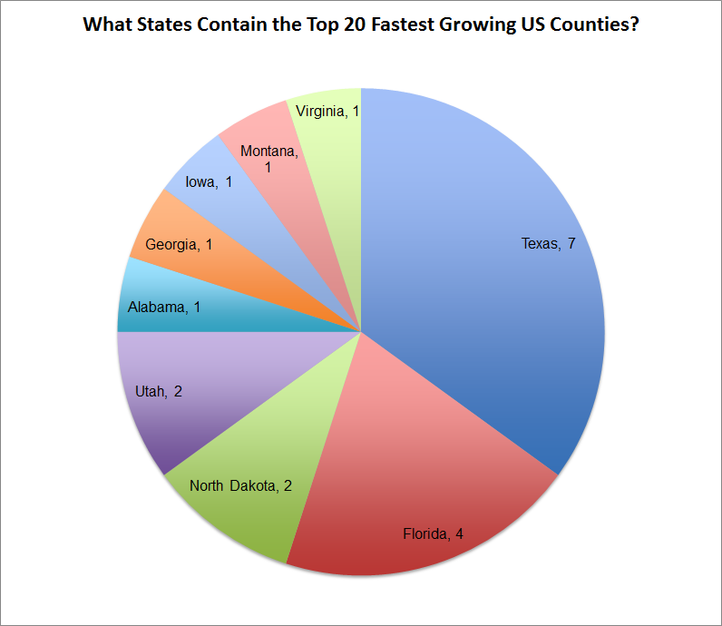 Texas contains 7 of the top 20 fastest growing counties while Florida has 4 counties.